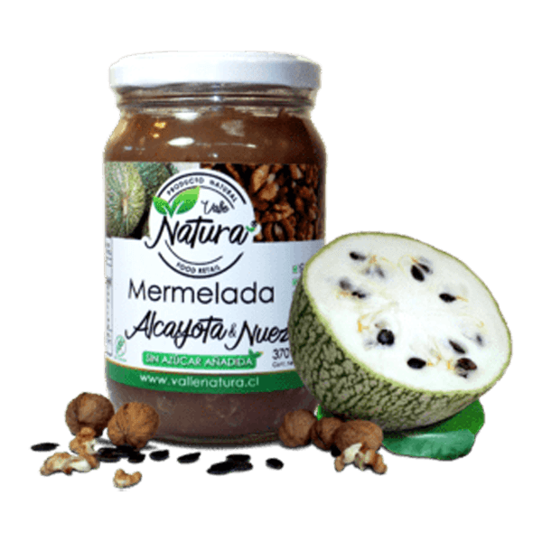 Mermelada de Alcayota & nuez (370 g) endulzada con jugo de fruta, sin azúcar añadida, sin aditivo, sin colorantes, sin preservantes, libre de sellos y sin gluten.