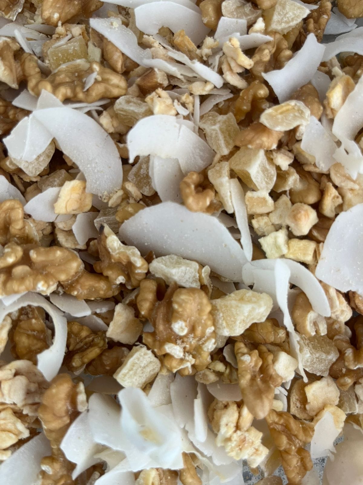 Disfruta de nuestro nuevo Mix Frutal, una combinación conveniente y nutritiva que ofrece un impulso de energía. Con una mezcla de nueces, piña y manzana deshidratada en cubitos y coco chips, este snack es perfecto para satisfacer tus antojos entre comidas o como colación rápida. Repleto de vitaminas, minerales y fibra, esta mezcla proporciona un impulso nutricional que te mantendrá en movimiento durante todo el día.